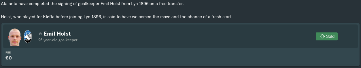 This really is an odd one. Emil Holst only joined us in January, but after making ONE appearance in the Cupen, he was getting tired of sitting on the bench. I obviously couldn’t do Holst any favours while Aalvik was still playing well, so I was happy to let him join another club for free.