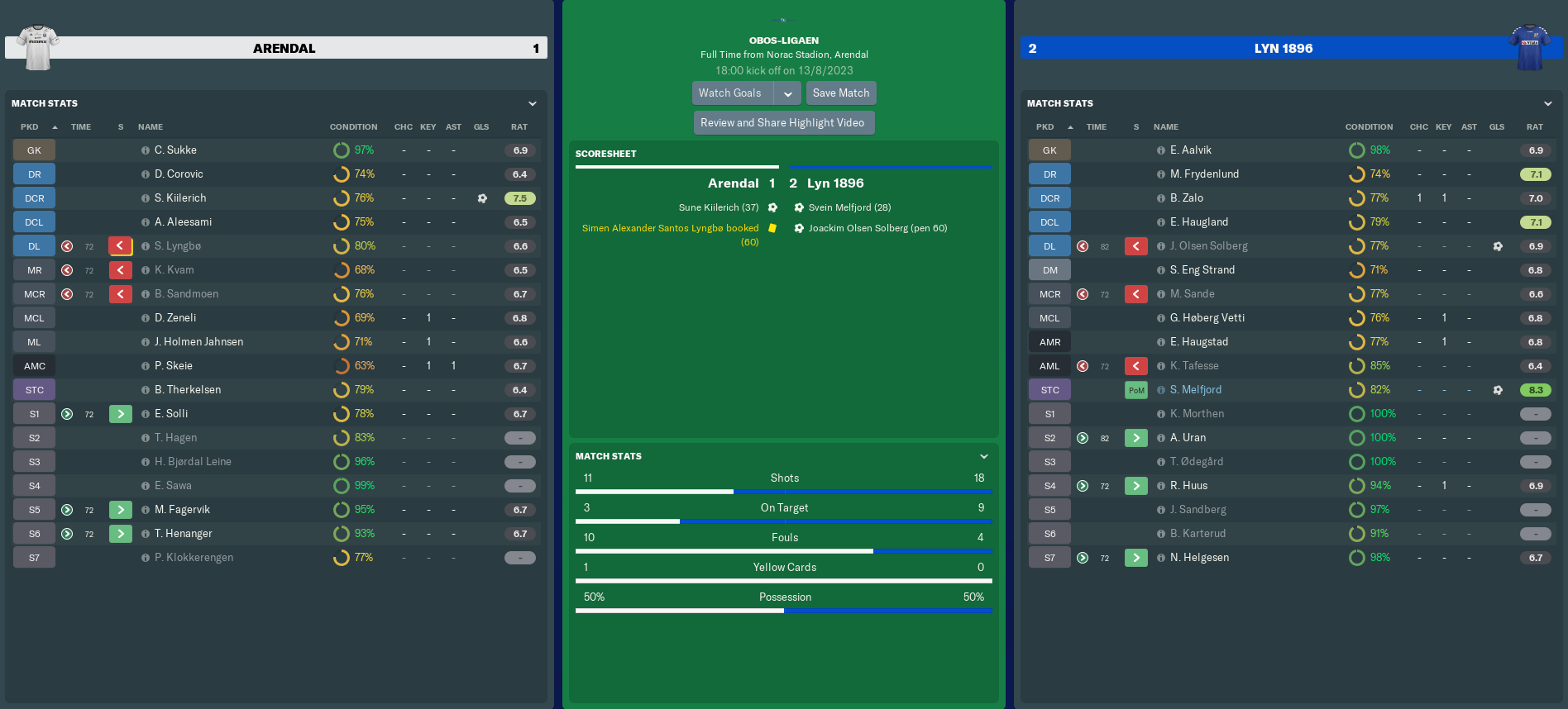 It took Arendal nine minutes to get back level. Preben Skeie’s corner was picked up by veteran centre-half Sune Kiilerich, who turned past a couple of Lyn players before finishing the move.