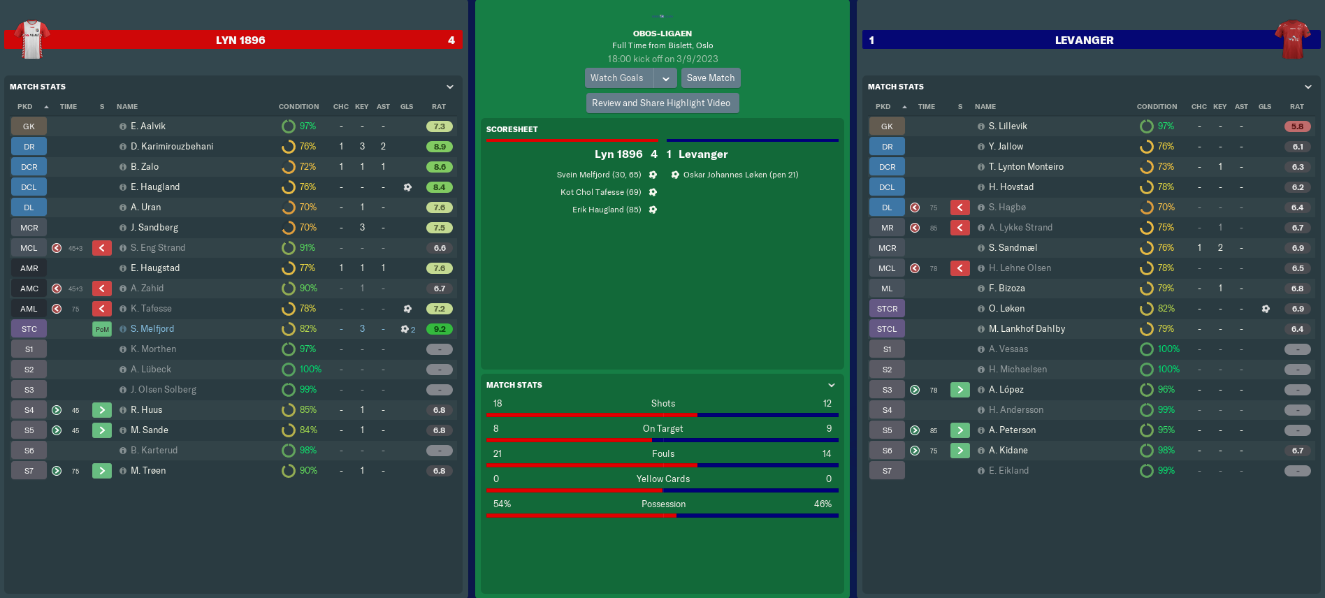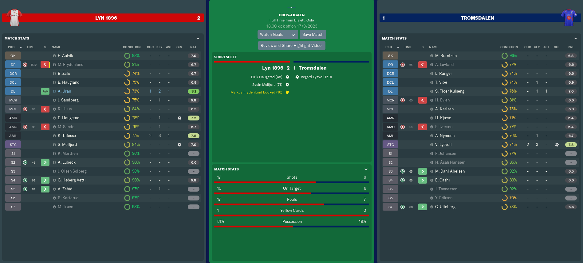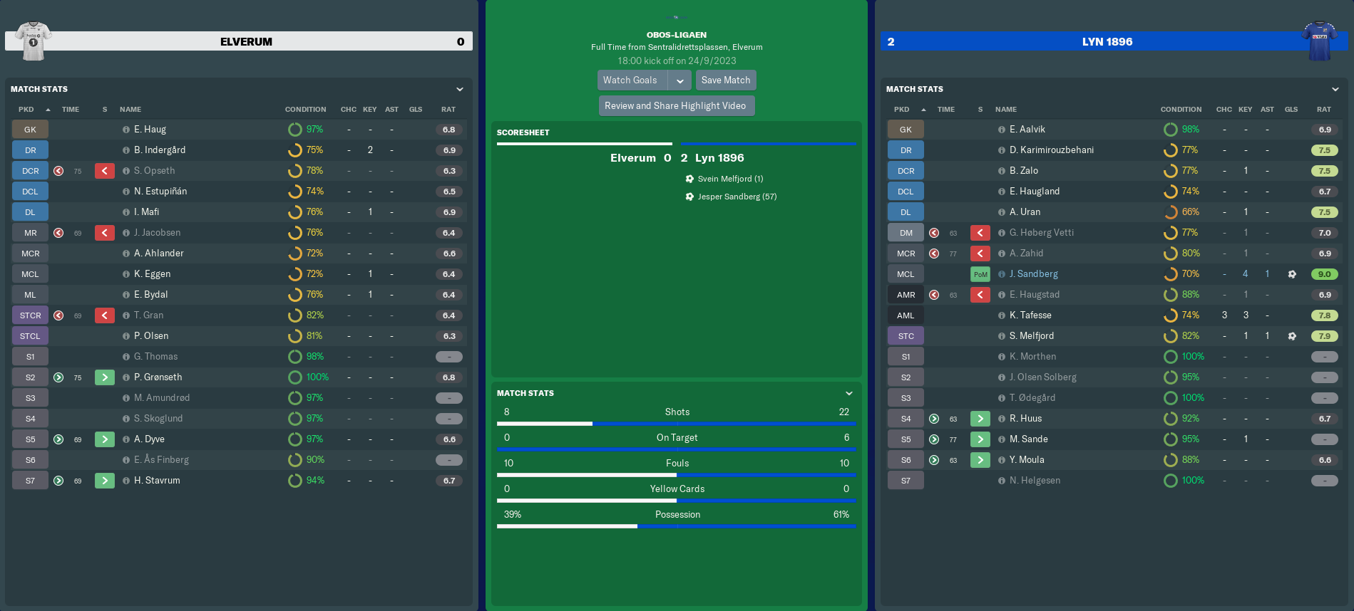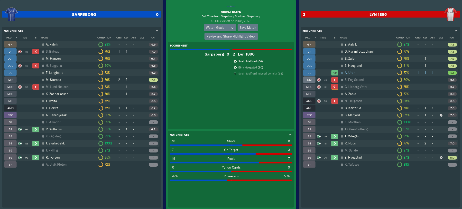 And before I forget… Sarpsborg tried to sign both Helgesen and Frydenlund on deadline day for pitiful money, which I obviously rejected. Niklas and Markus were both disappointed at not being allowed to discuss terms, but Anders and I convinced them to stay here. And it just so happened they would be going to Sarpsborg in the weekend anyway…