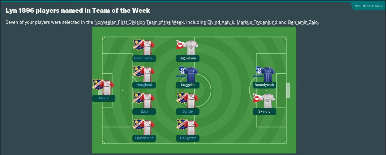 That’s a new record for us – seven players in the 1. divisjon Team of the Week. The other four came from Fredrikstad and Sarpsborg, who supplied two each. There was no sign of Melfjord, though…