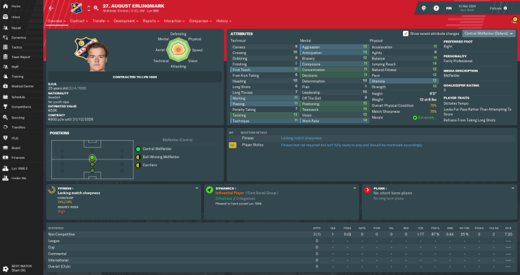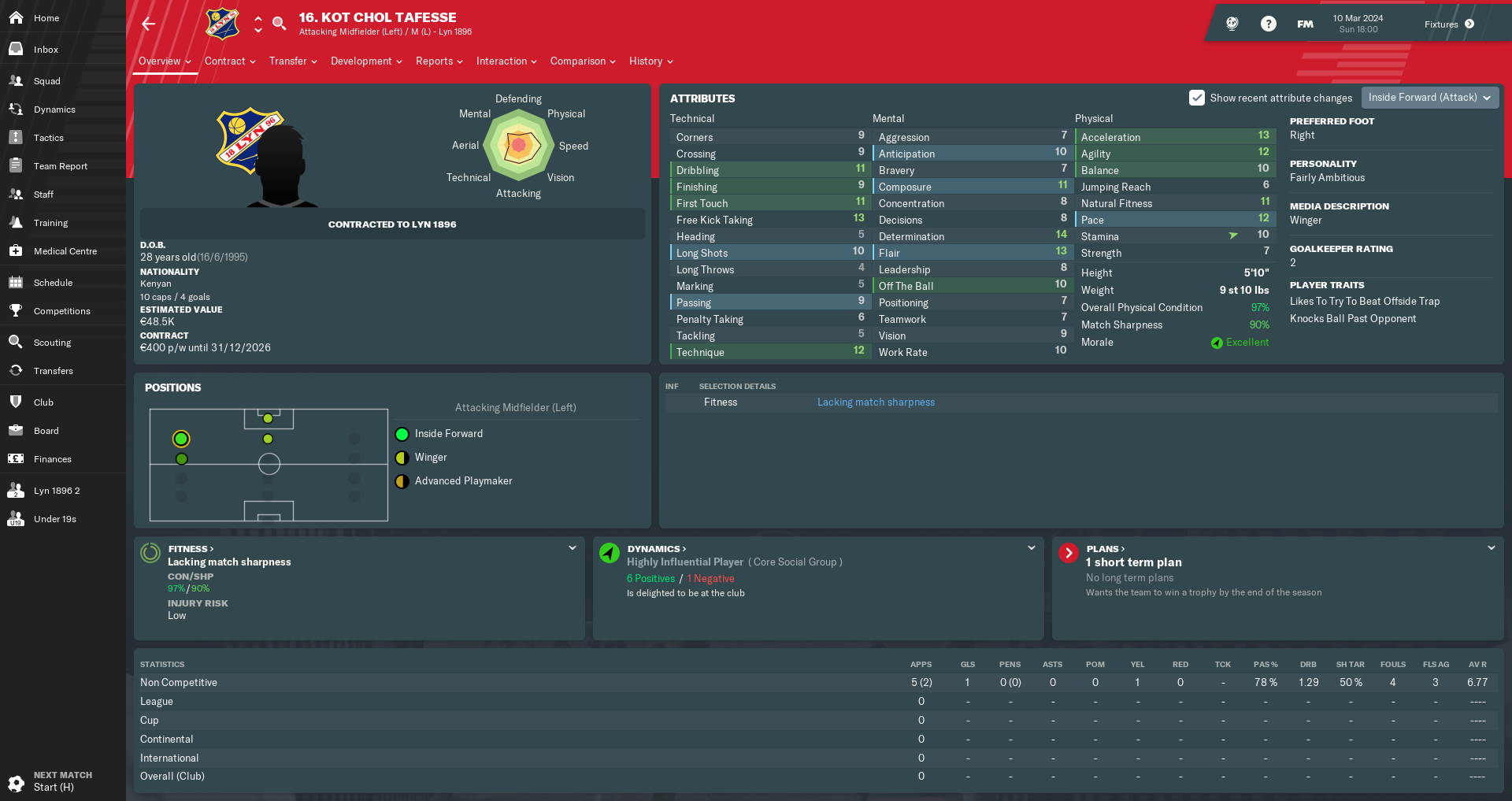Okay, let’s calm down expectations a bit. Unfortunately, we won’t use an attacking midfielder very often this year, so I might instead retrain Oinas as an inside-forward or even a deep-lying forward to get him into the team. He also has a ‘realistic’ and unsporting attitude on life, which could cause problems in the future.
