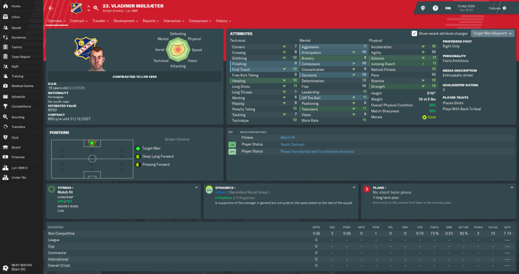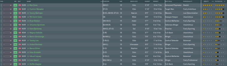 An interesting option up front is Vladimir Mølsæter, whom we’ve nicknamed ‘Vlad the Impaler’ [a peculiar choice, seeing as his Aggression is only 5]. For someone who’s only just turned 16, he’s remarkably strong and selfless, and he can be a real danger in the air. A fine career as a target man or a deep-lying forward surely awaits.