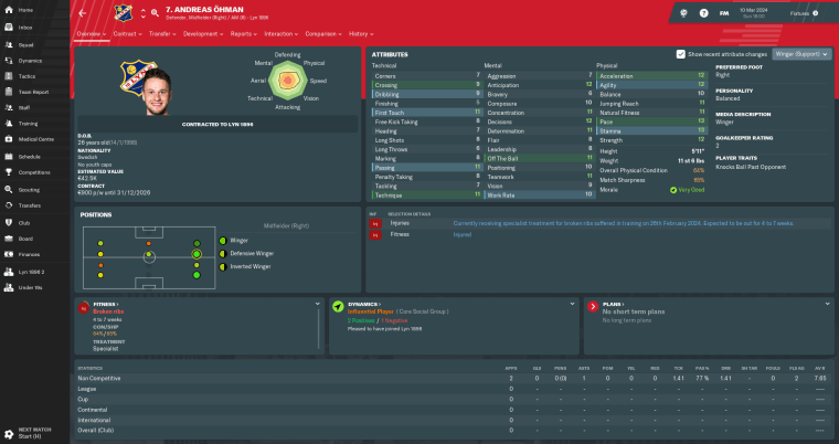 At least my only other remaining ‘original’ is still a big part of my plans. Haugstad has contributed 22 league goals and 20 league assists from right-wing since I became manager in 2019, hence his longevity. Eirik has just turned 30 and might start declining soon, but his professionalism and big-game expertise still make him a great asset.