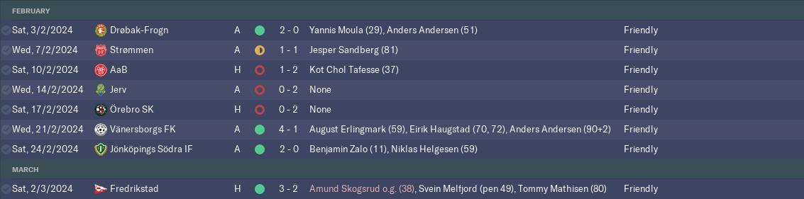 Our pre-season ended with a rematch of last year’s Playoff Semi Final against Fredrikstad, which was rather closer than the original game had been. Zernichow missed one penalty and Melfjord scored another for us as we battled towards a 3-2 win, though Fredrikstad netted the first and last goals.