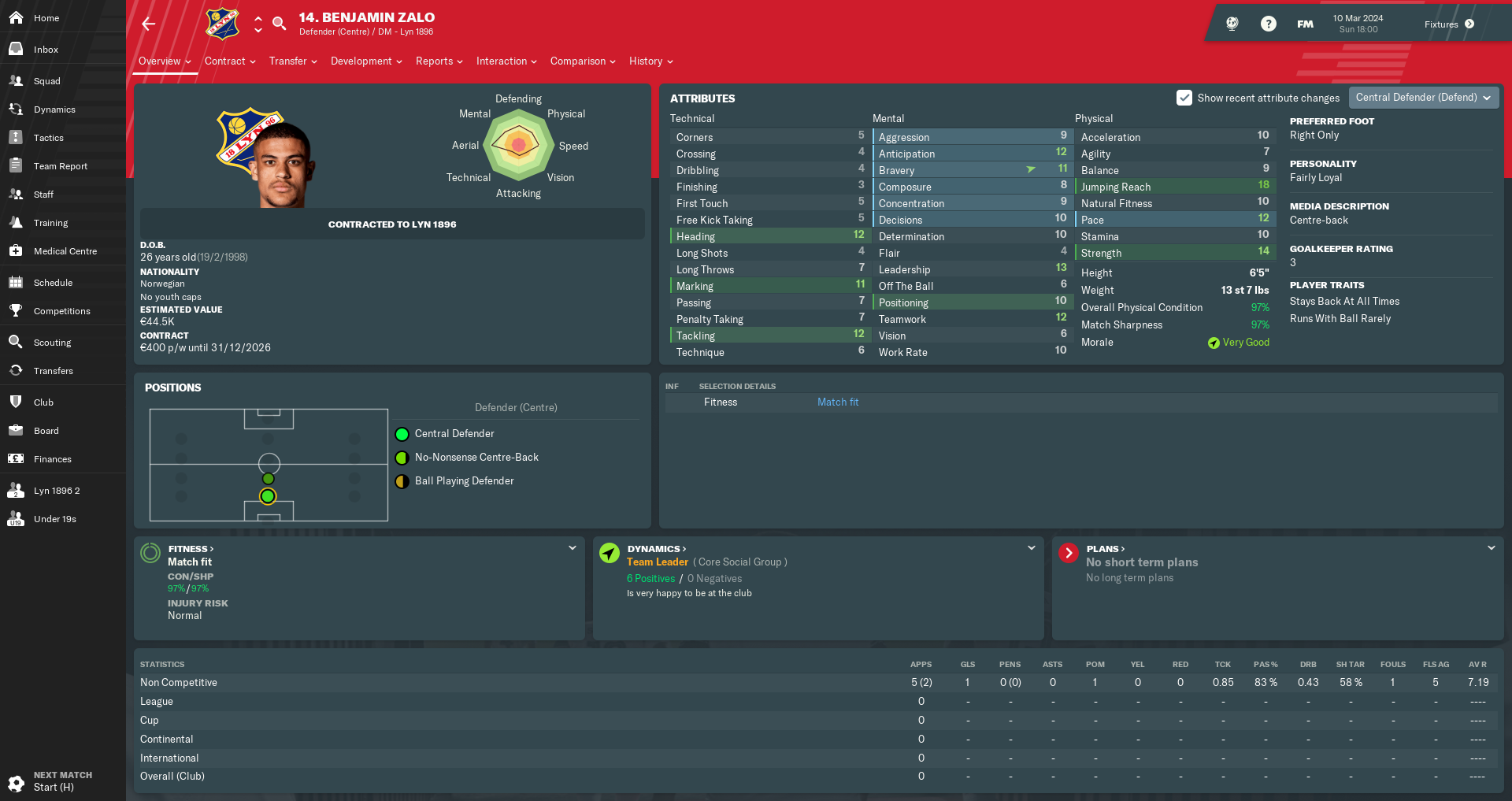 That’s partly why I brought in Lorentzen as a more assured central defensive partner to Zalo. 20-year-old loanees Falk Larsen and Akermann are also good, athetic options to play at the back, though I’ll mainly use the latter as a defensive midfield workhorse.