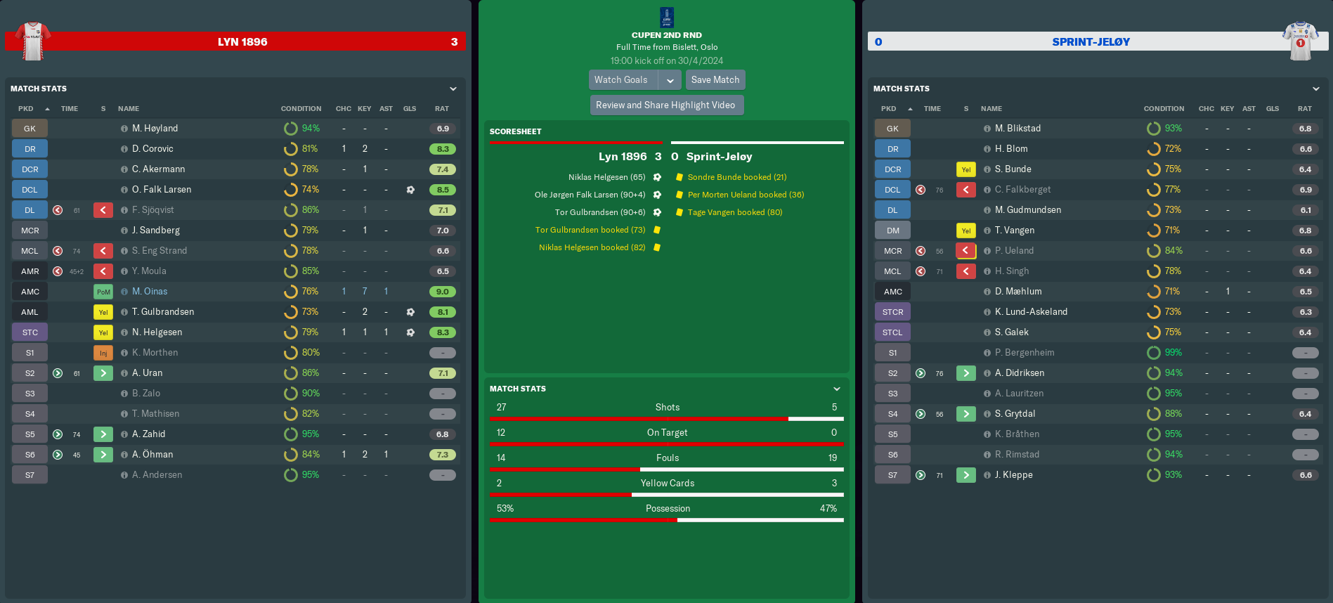 With the half-time score still at 0-0, I’ll admit that I lost my temper at my players in the dressing room. Once I calmed down, I instructed the team to play more direct, which eventually produced a reward in the 65th minute. 16-year-old playmaker Oinas got his maiden senior assist with a through-ball to Helgesen, who broke clear of the last defender and finished first-time.