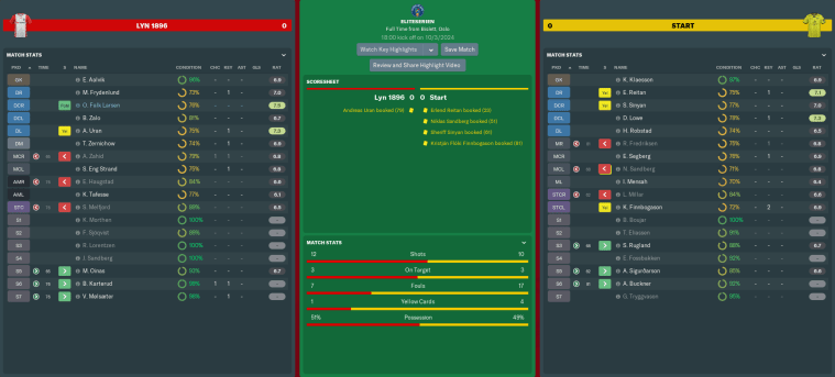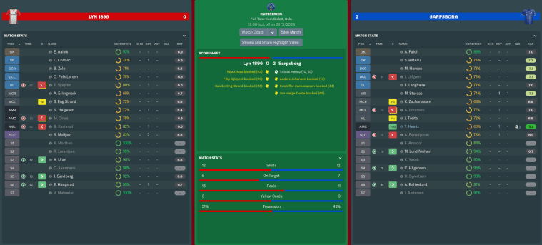 Teenage prodigies Max Oinas and Vladimir Mølsæter each got some gametime from the bench, with Vlad becoming Lyn’s youngest ever league debutant aged 16 years and 7 days. Unfortunately, they couldn’t inspire us to victory, though I was satisfied with a draw on our first game back in the Eliteserien since 2009.