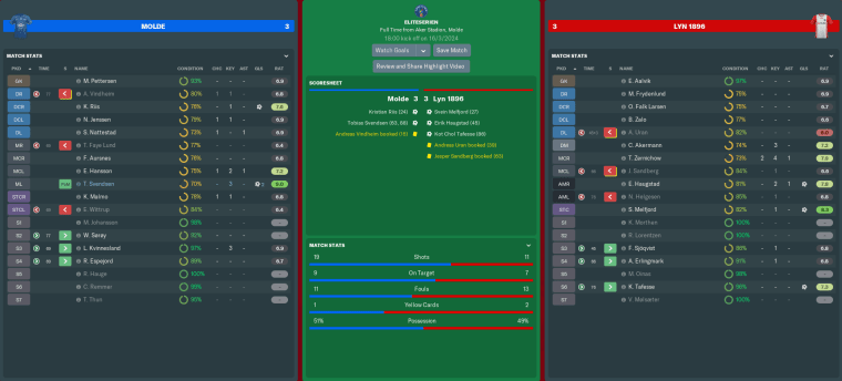 …until Molde hit us on the counter two minutes later. Teenage winger Lars Andre Kvinnesland’s cross found another substitute in striker Runar Espejord, whose shot was blocked by Eivind Aalvik. Unfortunately, Svendsen was first to the rebound and secured his brace to make it 3-3.