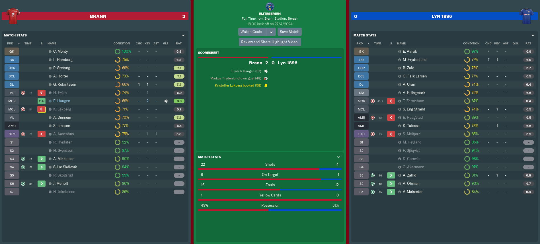 In the end, a 2-0 defeat really did flatter us. Brann could have had a third goal on 55 minutes, but Aasenhus was flagged offside after nodding in Aalvik’s spilt save from a powerful Haugen strike. Eivind was actually one of our best performers with a 6.9 rating, which went to show just how poor we were compared to the hosts.