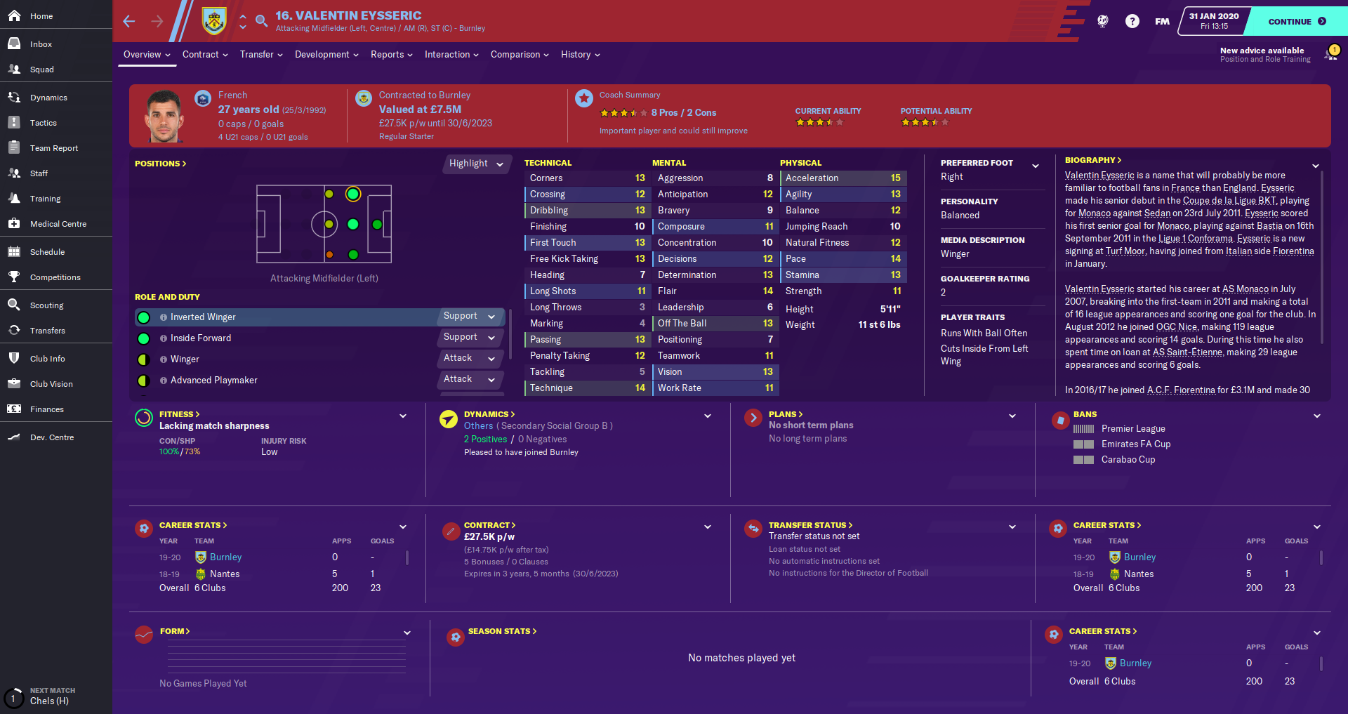 Yes, I’ve brought in another of my Fiorentina boys! French inside-forward Valentin Eysseric was my leading scorer over the course of my time in Florence, and with such solid attributes, it’s easy to see why. He’s not world-class; he just gets the job done.
