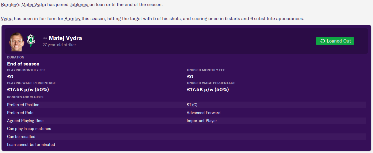 Instead, Vydra headed back home to the Czech Republic. Three Czech top-flight clubs made loan offers on deadline day, but only Jablonec offered both the wage contribution and the guaranteed first-team football I asked for.