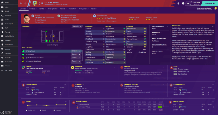 My first January signing was right-back Joel Ward – an £8.75million buy from Crystal Palace, for whom he’d made over 200 league appearances. I love a full-back who has high attribute scores in Teamwork, Work Rate and Stamina – and that ‘Driven’ personality was another big tick for me. The 30-year-old would provide Lowton with fresh competition now that Bardsley was gone.