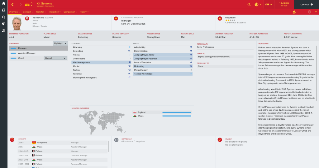 Ex-Wales defender Symons featured in over 100 matches for Fulham, where he later had a brief spell as manager a couple of years. A strong motivator, he expects his players to close down the opposition quickly and forcefully.