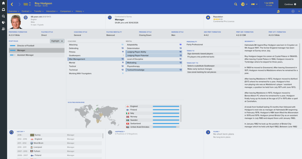 Affable sexagenarian polyglot Hodgson began his coaching career at Halmstad in 1976 – long before any of his Surrey players were born! Just don’t mention Nice… or Iceland… or ask him why Marcus Rashford was kept on the bench for 87 minutes.