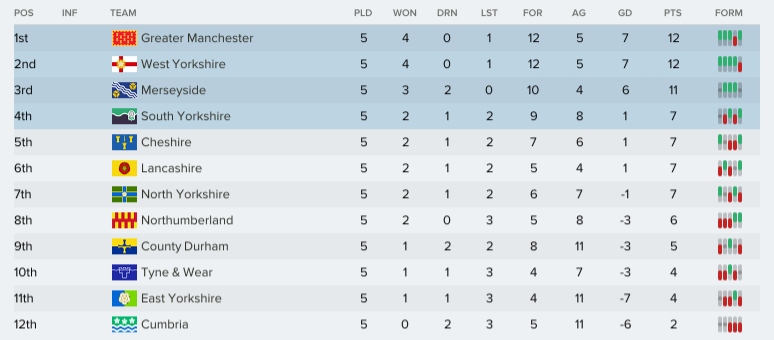 Greater Manchester and West Yorkshire established themselves as early frontrunners after recording the same 12-point records over five games. 3rd-place Merseyside’s unbeaten record just about stays intact, while 4th and 11th are separated by just three points. Sadly, Cumbria already have a lot of work to do.