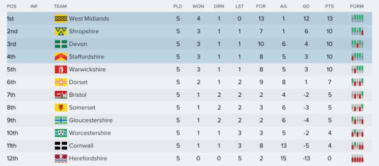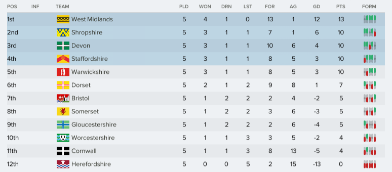 Having gone top the week before, the West Midlands consolidated their new status by scoring four of the five goals in their encounter with Somerset. Staffordshire were just as dominant when they prevailed 4-1 over Cornwall, whose first four matches had seen 19 goals.