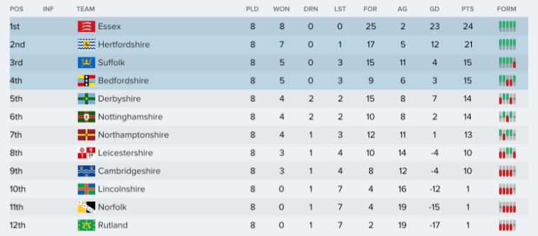 There’s still a long way to go, obviously, but you’ll have to go some to catch Essex or Hertfordshire now. Suffolk and Bedfordshire find themselves in the play-off places as well, though anyone could conceivably catch them over the coming weeks. (Okay… maybe not Lincolnshire. Or Norfolk. Or Rutland.)