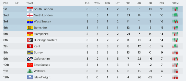 The South division is very competitive – certainly at the top. South London are ahead of North London and West Sussex only on goal difference, but 6th-placed Buckinghamshire are only a couple of points adrift. With no wins to their name, it’ll take a monumental effort for either Wiltshire or the Isle of Wight to enter the play-off picture now.
