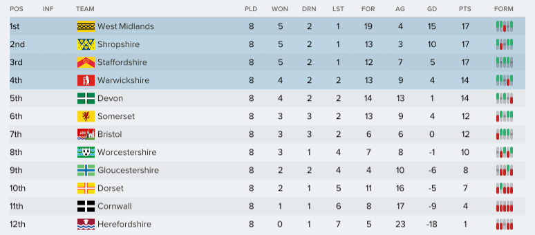 Devon closed the gap on the West Midlands, as Sam Gallagher’s winner against Gloucestershire lifted them up into 2nd. Also going level on points with the leaders were Staffordshire, whose attack proved too strong for Dorset. Shropshire missed an opportunity to do the same, drawing 1-1 at Somerset.