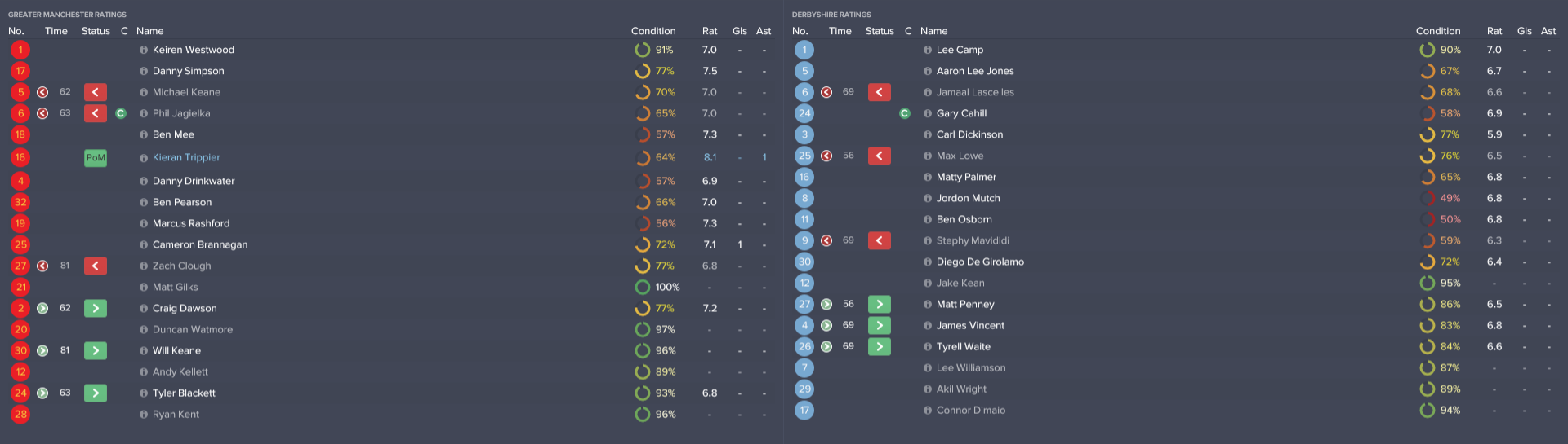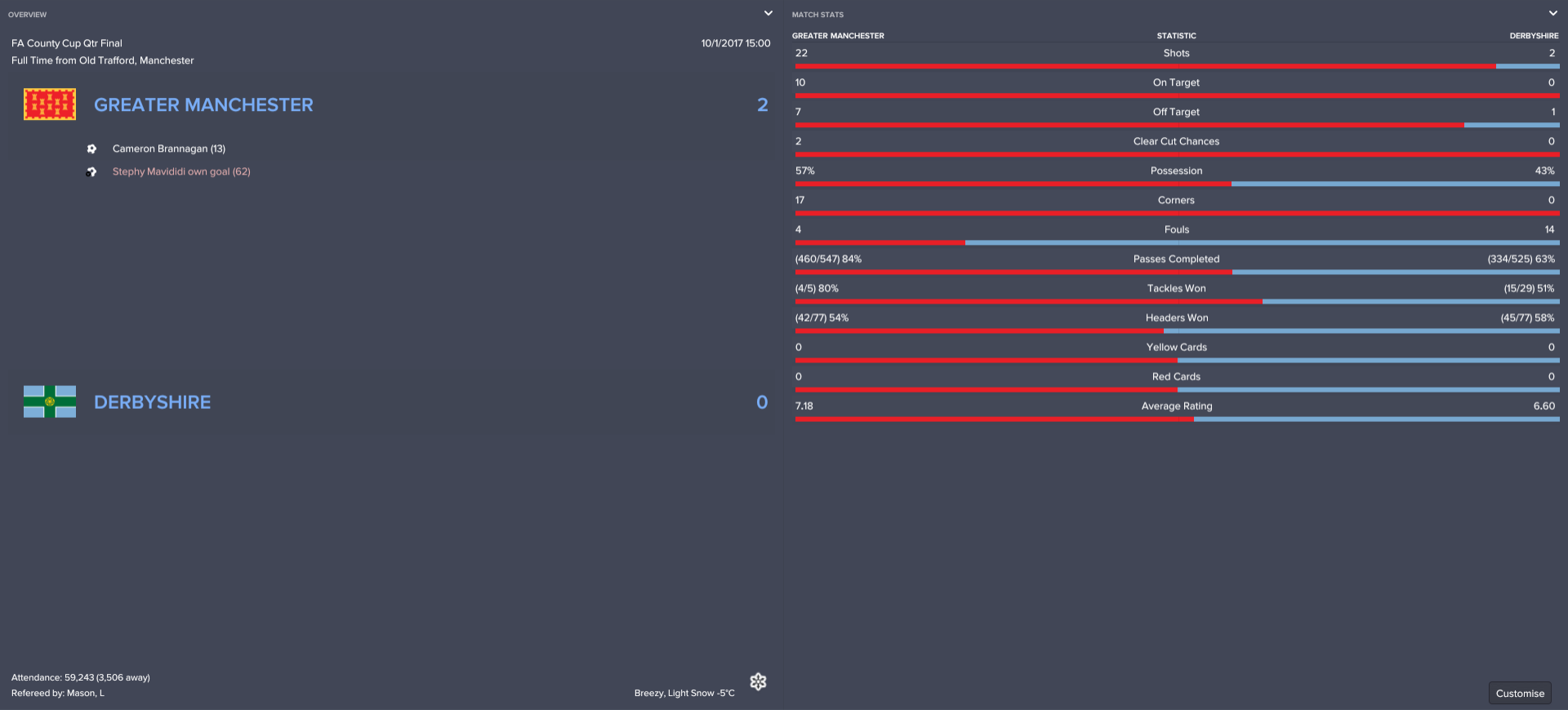 Derbyshire had accounted for Tyne & Wear in the last round, but Greater Manchester would prove far too strong. Things started to look ominous for Nigel Clough’s men in the fifth minute, when Zach Clough was only denied an early Mancunian opener by a determined block from Gary Cahill.