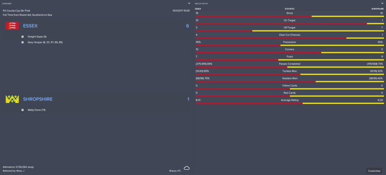 The beasts of the East, against one of the best teams in the West. It wasn’t even a contest, though, as Essex blew Shropshire away in the first eight minutes. Dwight Gayle’s fifth-minute opener was followed soon afterwards by a stunning Gary Hooper volley from Dominic Iorfa’s right-wing cross.