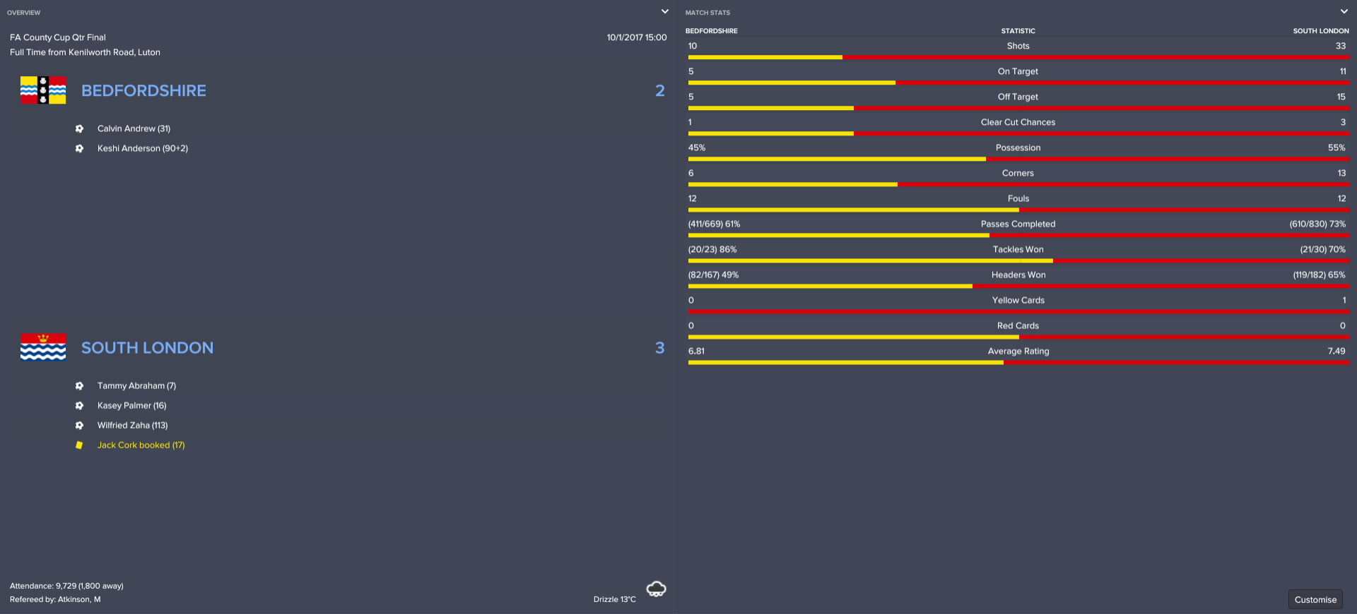 South London wasted a slew of chances to restore their two-goal advantage in the second half. Their frustration only heightened after Bedfordshire launched a last-ditch counterstrike in stoppage time. The visitors cried offside as Jay Dasilva played a first-time pass to Keshi Anderson, who thundered it home to take the game into extra-time.