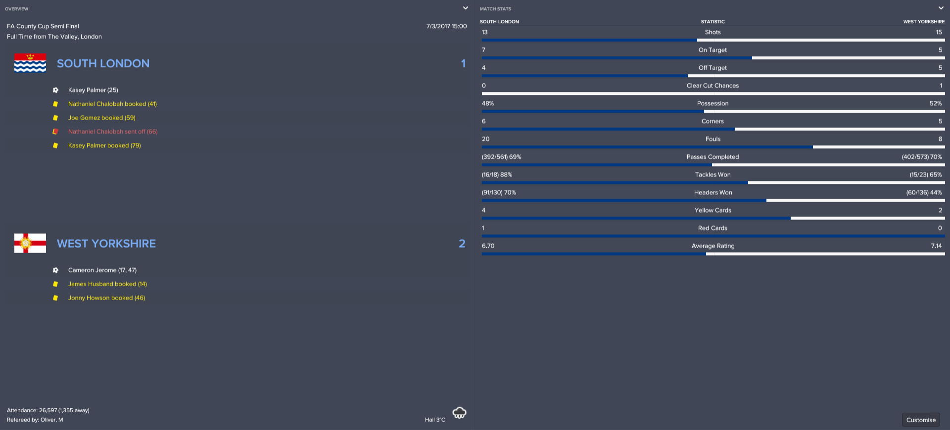 Having to play the best part of half an hour with 10 men was a hurdle South London could not overcome. Aside from a couple of chances from Ademola Lookman and Joe Gomez, they rarely tested West Yorkshire’s defence again. The final whistle confirmed that McCall’s men had held on for a 2-1 win and were heading for Wembley!