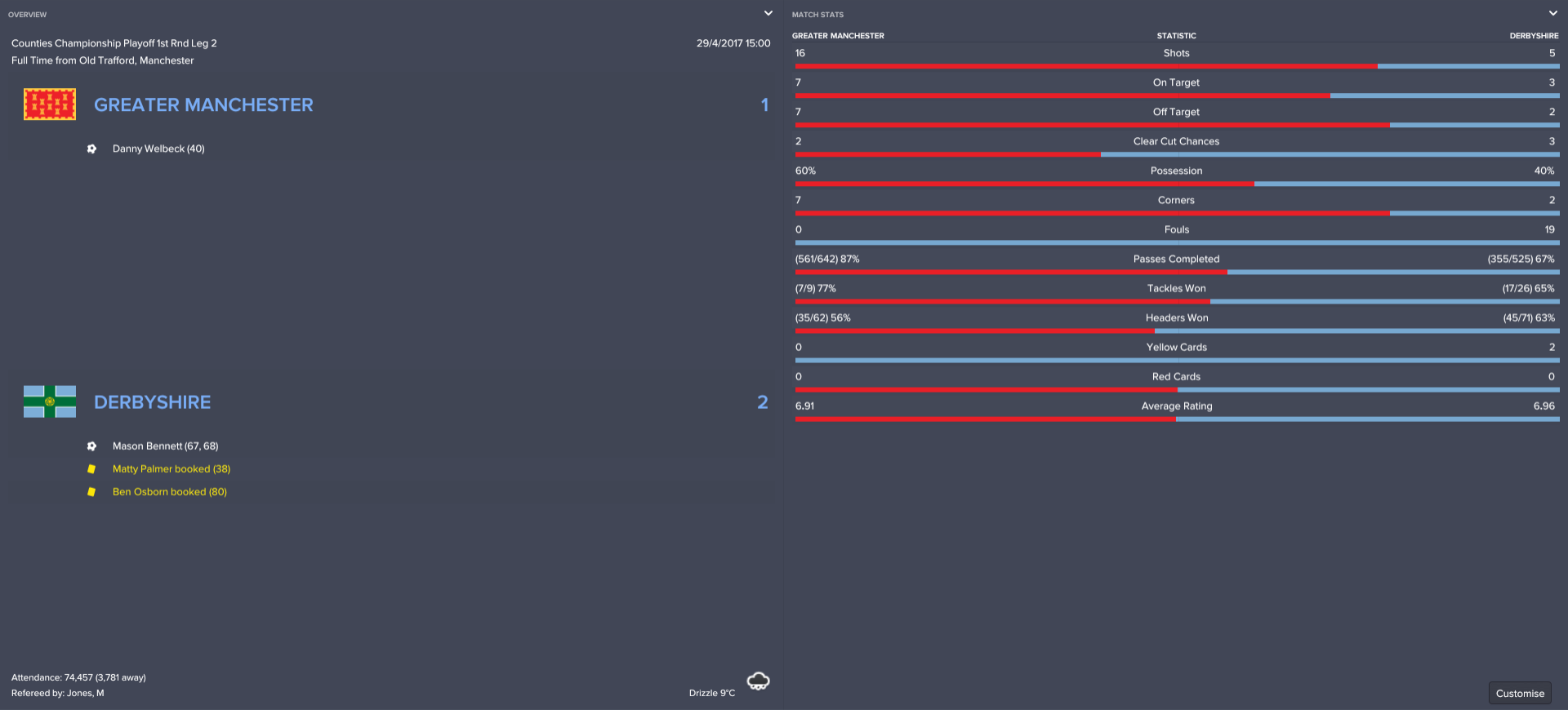 After such a shocking start to the first leg, Greater Manchester made sure they kept their composure in the first half of the rematch. Danny Welbeck and Danny Drinkwater each had early chances saved by Derbyshire goalkeeper Camp, who was keen to make amends for his horror show back home.