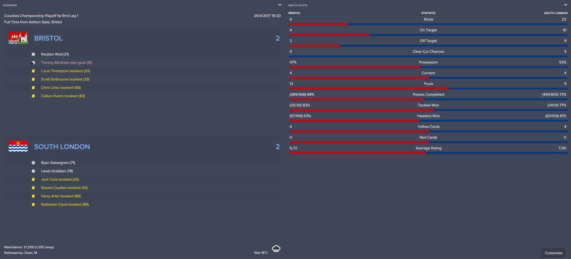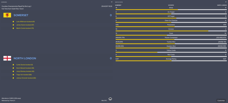 The first half was a dull affair, with Somerset’s Scott Sinclair and North London’s Yannick Bolasie each wasting half-chances but not much else happening. Well, aside from three Londoners getting their names into the referee’s book.