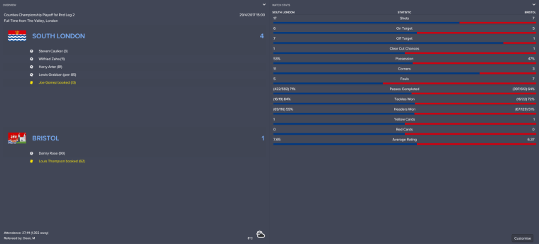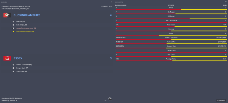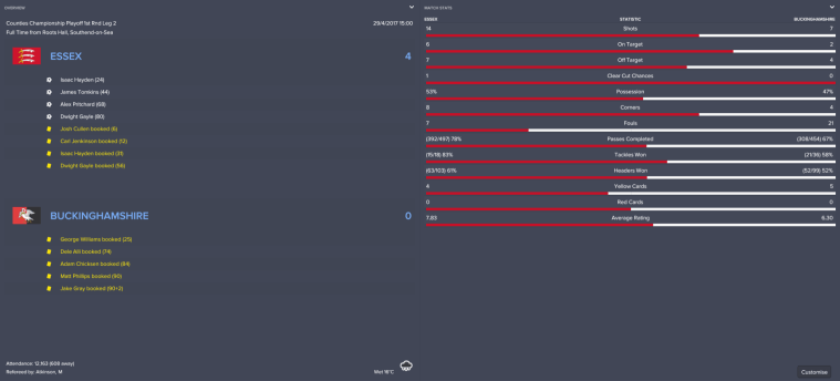 Though they quietly accepted that Bucks had won the first leg, Essex made sure they got themselves into a saveable position ahead of the second. A header from Dwight Gayle and a powerful shot from Josh Cullen in the final 15 minutes cut their deficit from 4-1 to a more manageable 4-3.