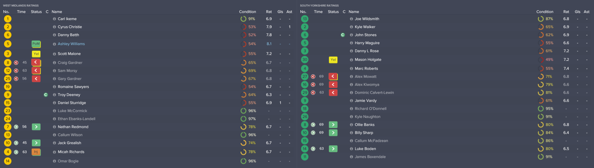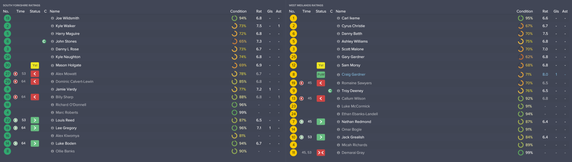 A close-fought centre-half ended with the West Midlands narrowly ahead in Sheffield. South Yorkshire captain John Stones was penalised in the 20th minute for tripping counterpart Troy Deeney, giving the Midlanders a free-kick close to goal. Craig Gardner fired the set-piece, with some help from a deflection off Alex Mowatt in the wall.