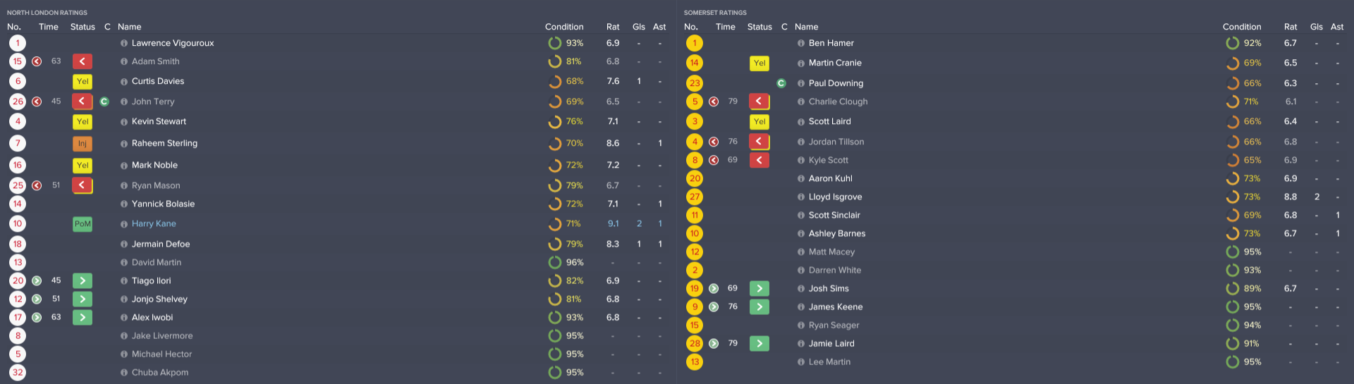 There was rather more goalmouth action in the second, but North London’s star striker Harry Kane simply could not take his chances. He and his strike partner Jermain Defoe were effectively dealt with by a resilient Somerset defence, in which skipper Paul Downing had put in a particularly strong shift.