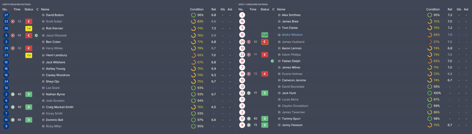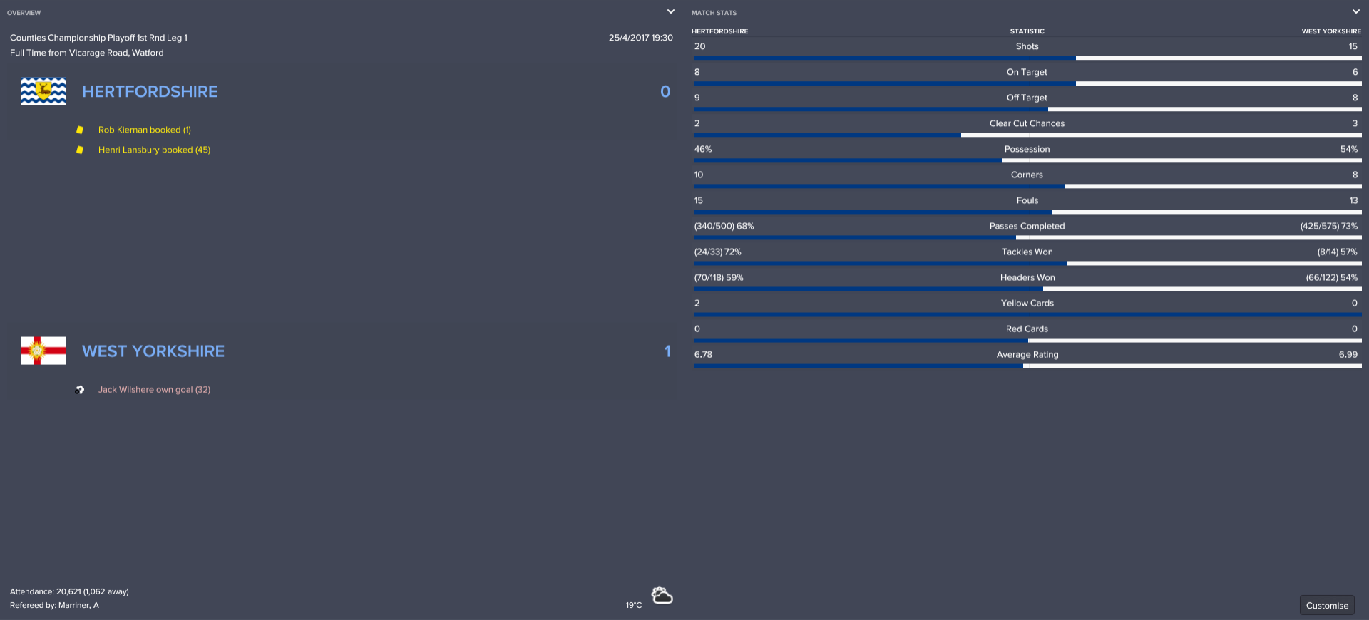 The breakthrough came after 32 minutes, when Hertfordshire’s attacking midfielder Jack Wilshere found the net. Unfortunately, it was his own net in which he had chested a right-wing cross from Aaron Lennon, leaving Button helpless.