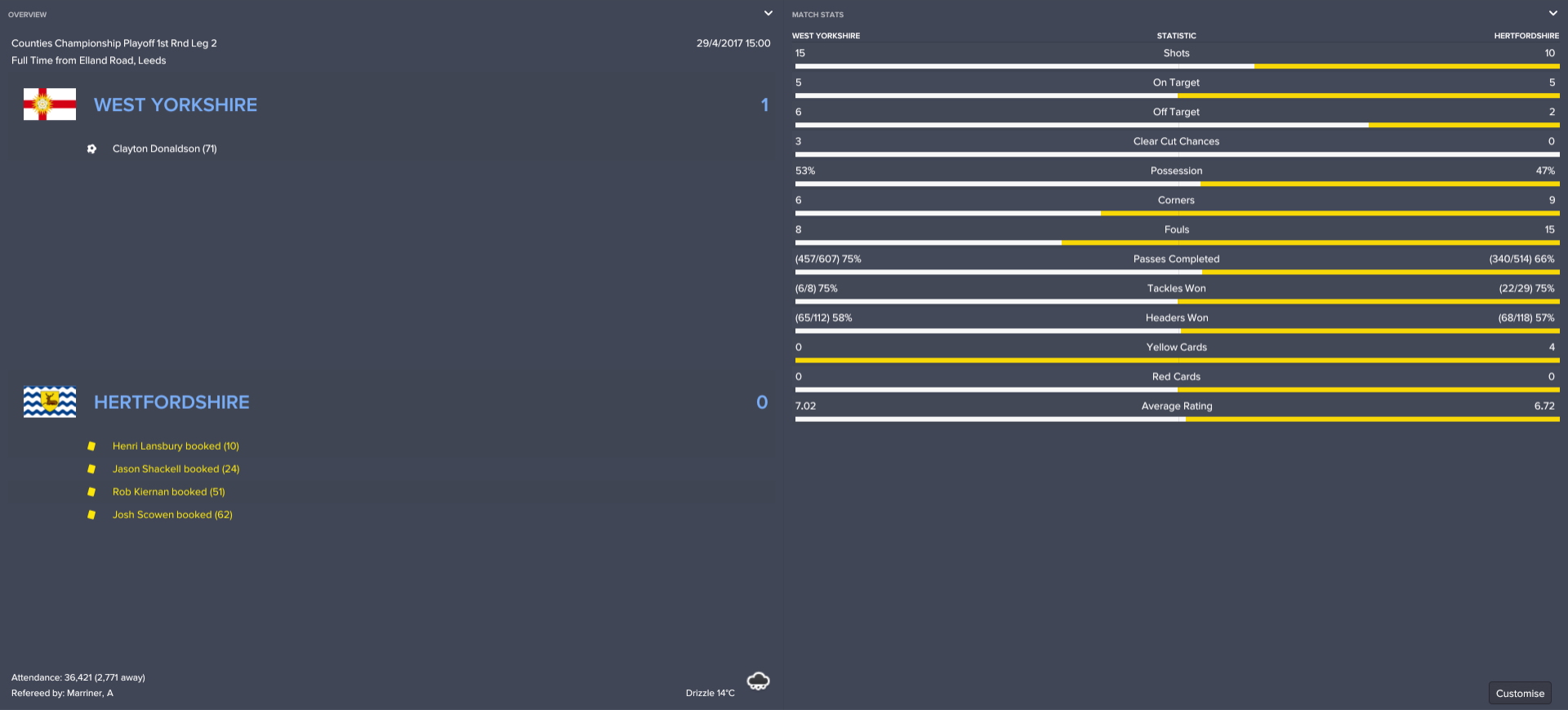 West Yorkshire could have added to their 1-0 first-leg advantage less than a quarter-hour into the second match. Stuart McCall’s side confidently stroked the ball across the Hertfordshire half before Husband put in a left-wing cross that Cameron Jerome could only fire against the post.
