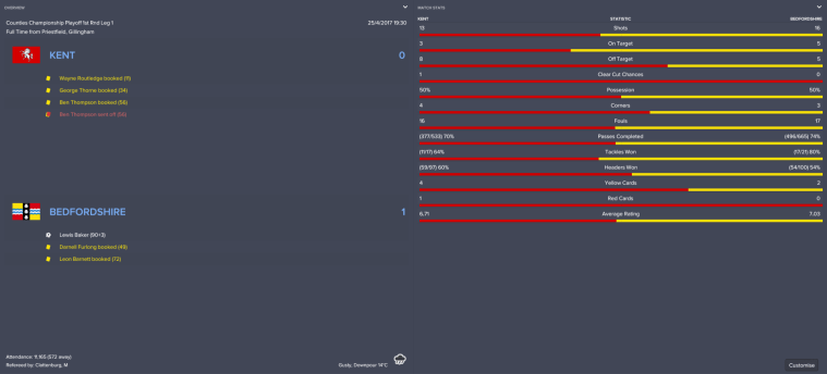 Kent were doing a good job of shutting Beds out until midfielder Ben Thompson lost his head in the 56th minute. Just moments after collecting a yellow card for tripping striker Calvin Andrew, Thompson received another for nobbling the same player.