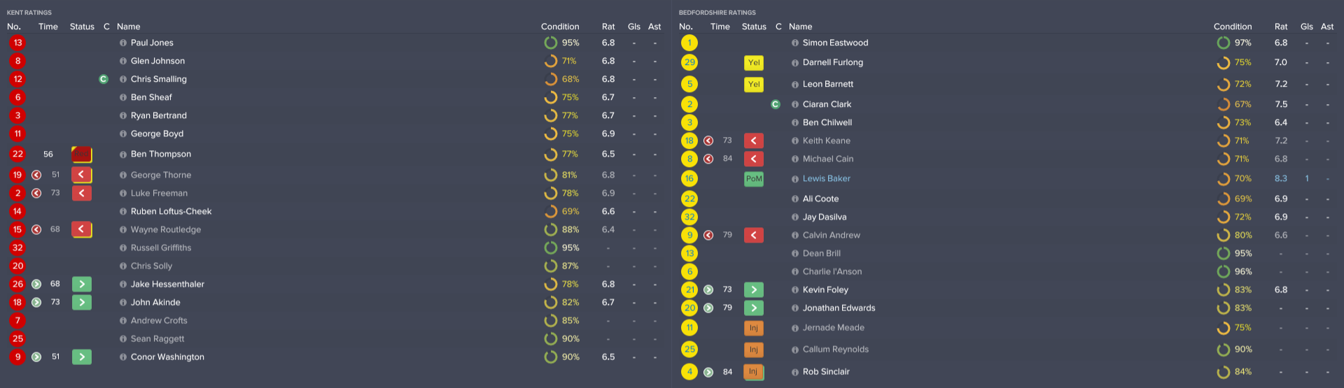 Despite being down to 10 men, the hosts kept the score at 0-0 until the dying moments, when right-back Glen Johnson committed an even costlier foul on Jay Dasilva. Bedfordshire midfielder Lewis Baker had a free-kick about 25 yards from goal, and he lifted it over the wall and into the net to snatch a dramatic away win!