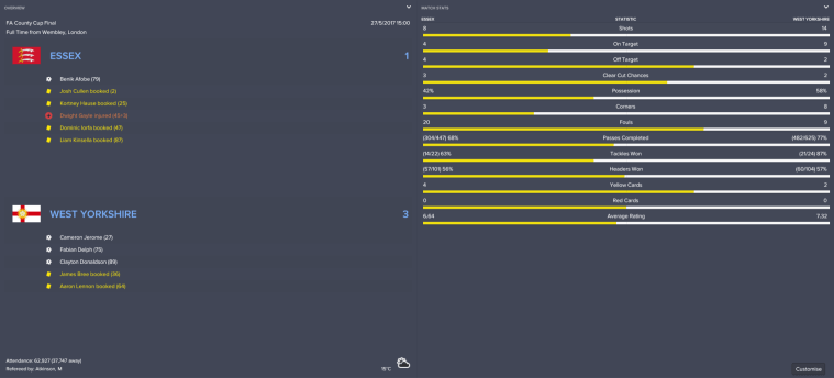Essex had got themselves back in the game, but this put the pressure right back on them again. They were steadily running out of time when, in the 87th minute, Kinsella picked up their fourth yellow card of the game for a clumsy tackle on Holmes. By contrast, Atkinson had only booked two of his fellow West Yorkshiremen.