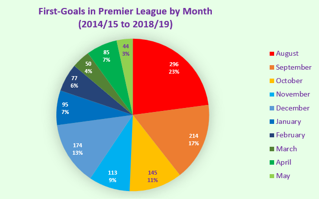 Shock of the century: more first-goals come in August than in any other month. The opening month of the campaign accounts for 23% of all Premier League FGs – and 28% of those in League Two.