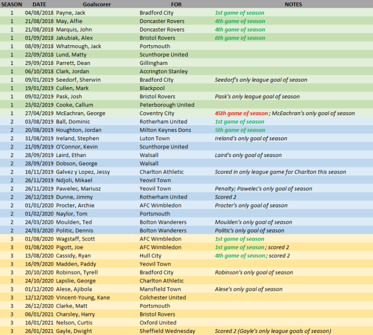 I’ve recorded data for every instance a player scored their first goal in the relevant division that season. Own goals don’t count (obviously), and goals scored in cup competitions or other leagues aren’t considered either. If a player scored for two clubs in the same league in the same season, only their first goal for their first club is included.