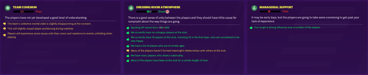 That was the state of our dynamics as we headed for the Algarve. Cohesion was still poor, and it would likely stay that way while the players adjusted to my tactics – and to each other. In the meantime, I would need to keep the dressing room atmosphere at a decent level. Winning over team leaders Coates and Mathieu (who were both ‘opposed’ to me, possibly because of my inexperience) would be a start.