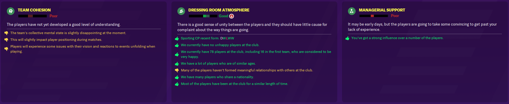 That was the state of our dynamics as we headed for the Algarve. Cohesion was still poor, and it would likely stay that way while the players adjusted to my tactics – and to each other. In the meantime, I would need to keep the dressing room atmosphere at a decent level. Winning over team leaders Coates and Mathieu (who were both ‘opposed’ to me, possibly because of my inexperience) would be a start.
