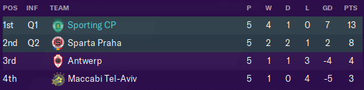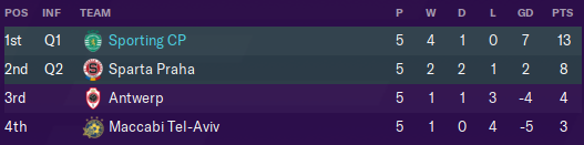 A second group win left us three points clear at the top of Group I, with Sparta Praha having risen to 2nd after winning 1-0 at Maccabi Tel-Aviv. If we could beat Antwerp again at their place a fortnight later, we would be on the brink of the knockout rounds. Good times!