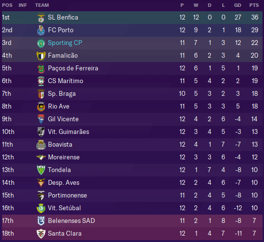 After our last league match of November, the gap between us and the unstoppable Benfica juggernaut had increased to 14 points. Even Porto had proven no match for our city rivals, with their 5-1 home loss to the Águias boosting our hopes of catching them up in 2nd. In the meantime, we still had to fend off a bunch of teams looking to displace us.
