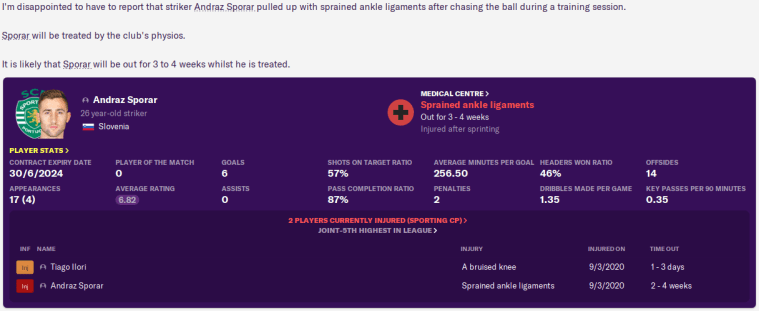 And as sure as night turns into day, Sporar sprained his ankle three days later. Seriously… is he the Slovenian Andy Carroll or something?