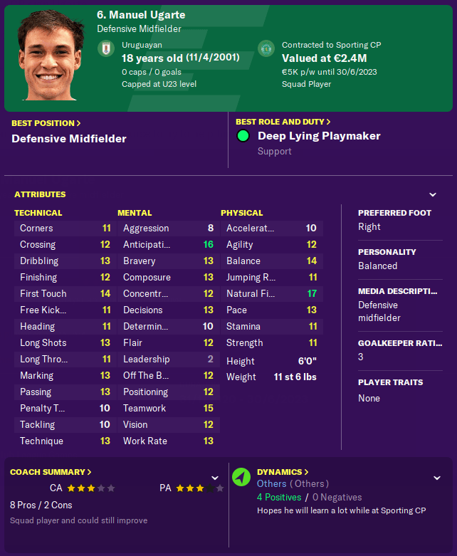 So, here is Manuel Ugarte – a Uruguay Under-23s international who joined us from Fénix for €1.8million on deadline day. The 18-year-old is a smart and naturally fit deep-lying playmaker who can also do a decent job as a defensive midfielder.