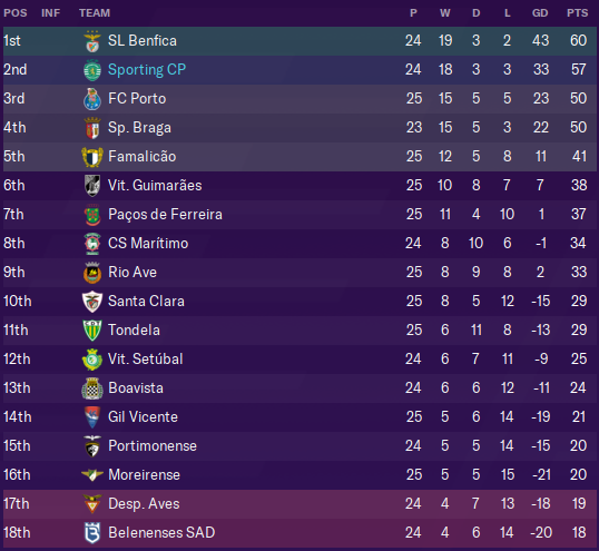 A few hours later, we watched Famalicão dominate Porto 3-0 and leave the Dragões SEVEN points behind us, having played an extra game! 4th-placed Braga had drawn level on points with them and had a couple of games in hand, so perhaps they were now our main rivals for a Champions League berth!