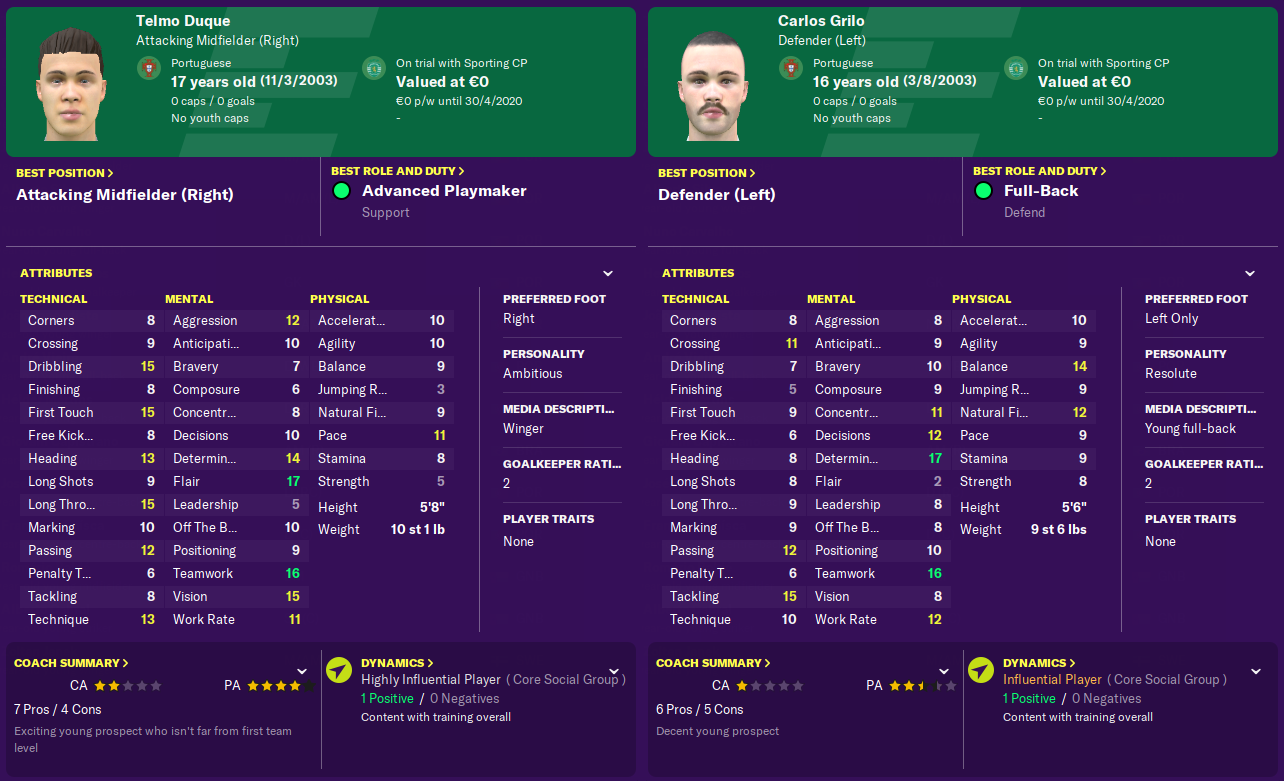The best of the rest is left-back Carlos Grilo – a resolute and committed tackler who is quite comfortable on the ball. Carlos also has a, ahem, rather impressive moustache for a 16-year-old. (Seriously, Sports Interactive, PLEASE sort out your newgen faces on FM21.)