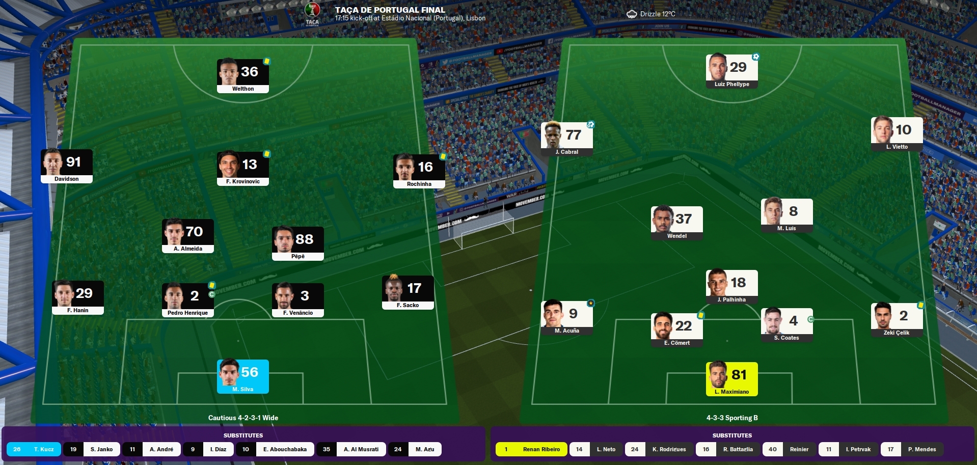 With no injuries or suspensions to worry about, I could name my strongest XI at the Estádio Nacional. My only real headache was over the left wing position, where I eventually plumped for Cabral over Petryak. Another big call was to start Miguel Luís in the playmaker role rather than Reinier, whose form had fallen off a cliff since March.