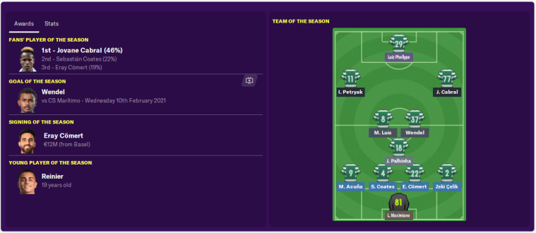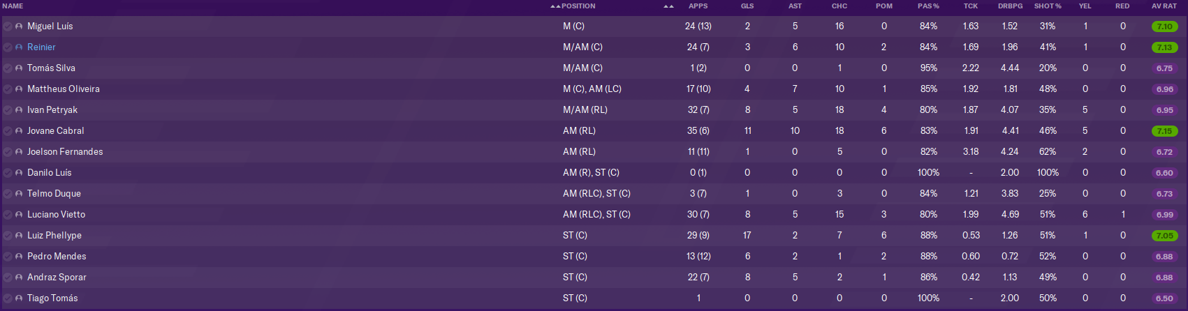 Across all competitions, Big Phil and Jovane were the only two Sporting players to reach double figures for goals. Vietto and summer signing Ivan Petryak each chipped in eight goals, as did Andraz Sporar. I effectively froze the frustrating but occasionally fantastic Slovene out of the team from April after a dispute over a new contract escalated.