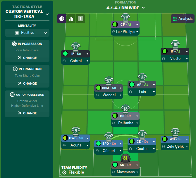 The most recent changes I’ve made to this system include turning on ‘Pass Into Space’, which instructs players to look for open spaces for team-mates to exploit. I’ve also converted the right-winger to an inside-forward, which has partly contributed to an upturn in form for Vietto – a skilful dribber who’s mainly right-footed but is also pretty comfortable on his left.